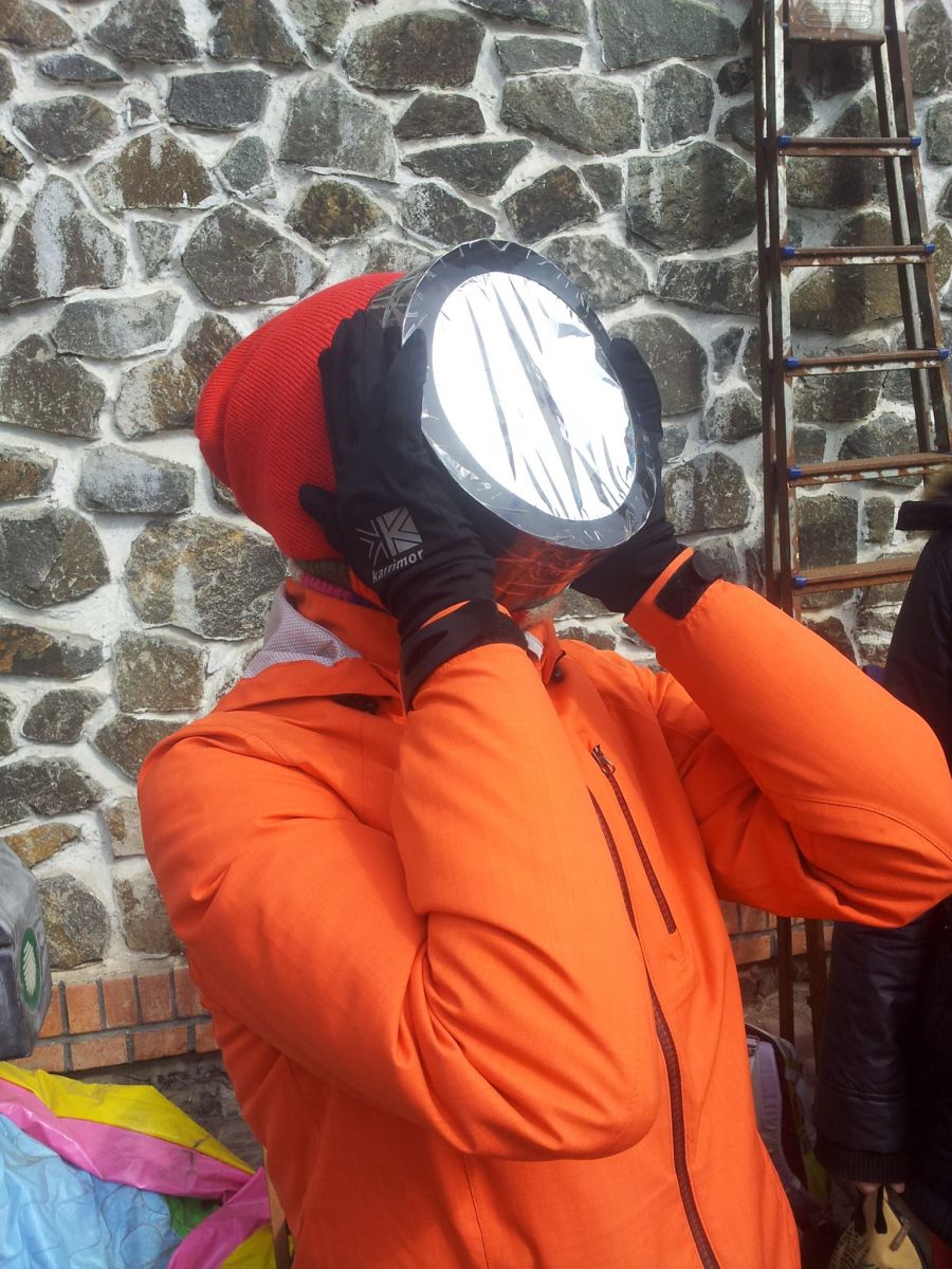 С небольшими перерывами на облака, мы продвигались ближе к максимальной фазе, во время которой попалось достаточно длинное и чистое окно. Тактильно чувствовалось, что солнечный свет стал холоднее, а освещение напоминало яркий свет люминесцентных ламп. По очереди все присутствующие возле телескопа могли наблюдать затмение собственными глазами через солнечный фильтр.