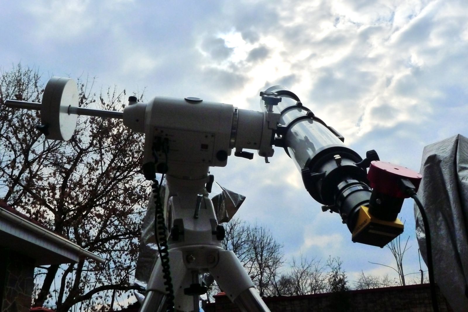 Всю рабочую неделю до пятницы 20-го марта, основной темой для разговоров была погода. Прогнозы на пятничное утро то расстраивали, то обнадёживали, и всё-таки утро перед затмением встретило нас чистым голубым небом. Позавтракав, сразу перешли к сборке телескопа - на монтировку Sky-Watcher EQ6 SynTrack был посажен плод совокупления солнечного телескопа Coronado с телескопом ТАЛ - "ТАЛонадо". Запечатлением момента занималась камера ZWO ASI120MM с редюсером 0,5х от GSO для более широкого поля. С таким нестандартным аксессуаром мы ясно наблюдали что размер рабочей зоны H-alpha фильтра значительно меньше нашего поля зрения.