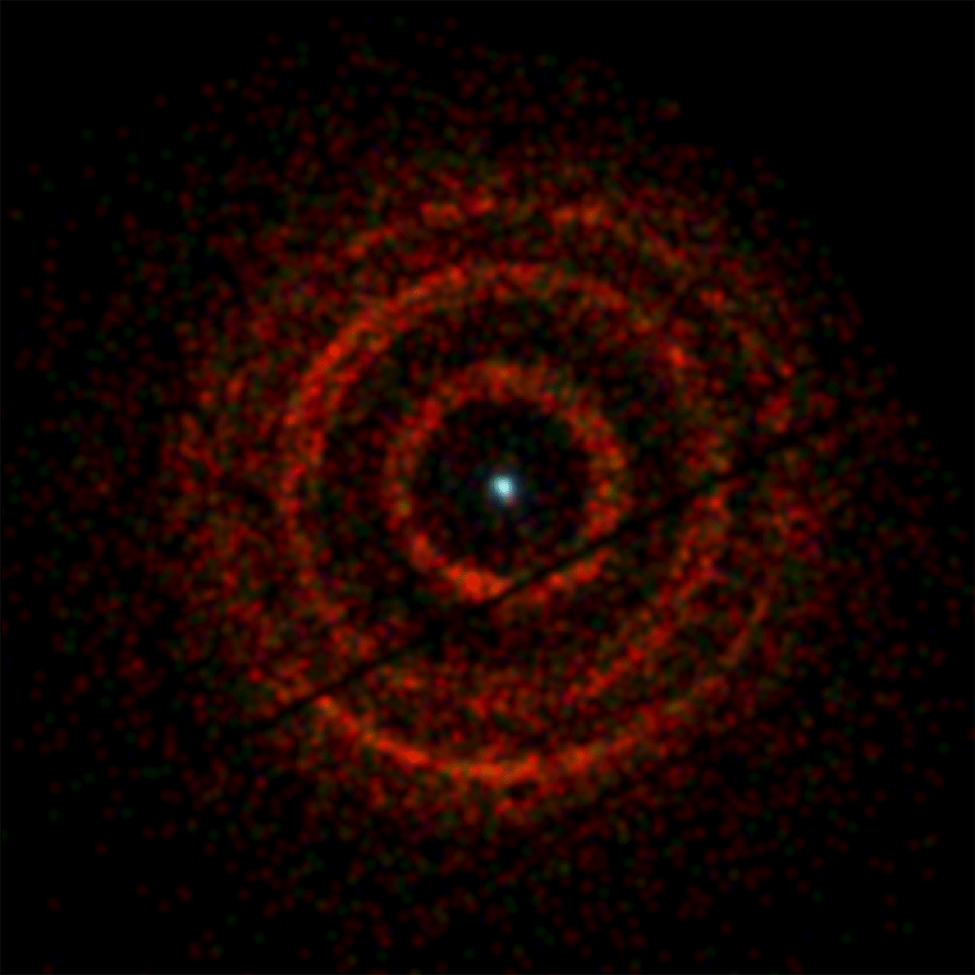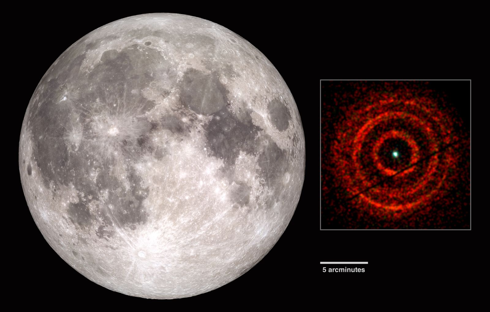 Астрономы говорят, что дополнительные кольца - результат "эхо" рентгеновского света. Вспышка черной дыры испускает рентгеновские лучи во всех направлениях. Слои пыли отражают некоторые из этих рентгеновских лучей обратно к нам, но свет проходит большее расстояние и достигает нас немного позже, чем свет, проходящий по более прямому пути. Время задержки создает световое эхо, образуя кольца, которые расширяются со временем.