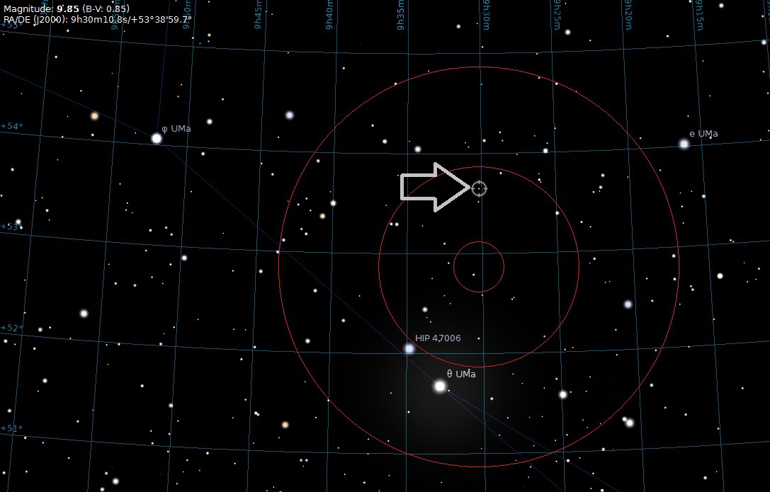 И вы можете увидеть 1SWASP J093010.78 + 533859,5 своими глазами. Система находится в 250 световых лет от нас, и имеет +9 звёздную величину. Она расположена в 1,5 градусов на северо-северо-запад от звезды Тета Большой Медведицы. Сложно, но не невозможно будет разрешить две основные пары звёзд, расстояние между ними сейчас 1,88”.