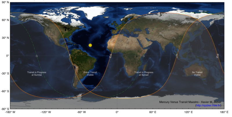 Прохождение будет наблюдаться практически со всей поверхности земли, кроме Австралии, Океании и Антарктики. В наших широтах мы сможем наблюдать первый контакт и большую часть транзита, солнце уйдет за горизонт раньше, чем Меркурий покинет поверхность Солнца. Последний раз это явление можно было наблюдать в 2003-м году.