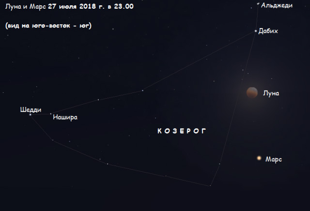 Марс легко можно будет обнаружить на небе - в момент максимума затмения Луны он будет прямо под ней, в созвездии Козерога.