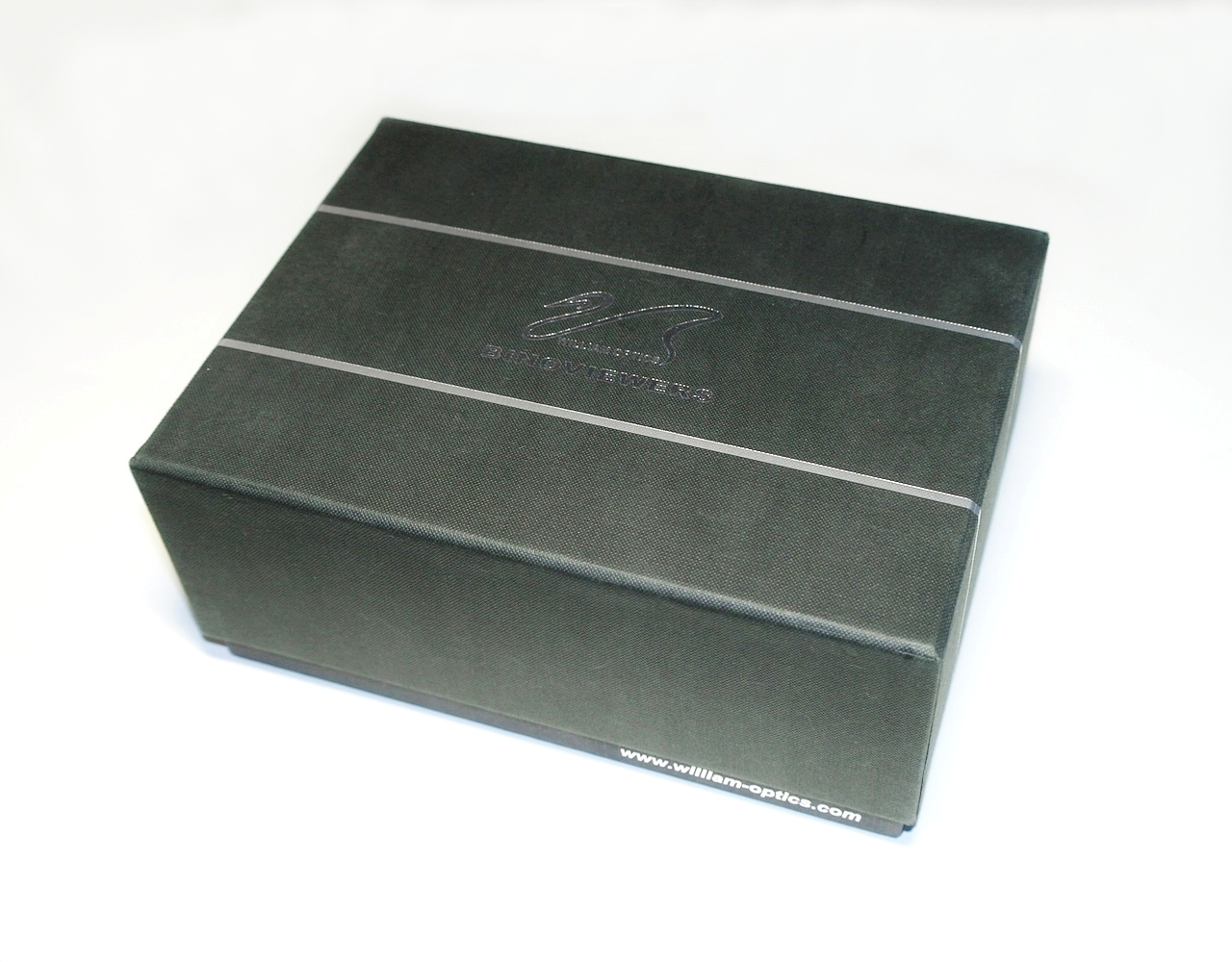 На крышке коробки нанесена большая эмблема в виде стилизованного лебедя торговой марки William Optics серебристого цвета и выполнена надпись WILLIAM OPTICS / BINOVIEWERS.