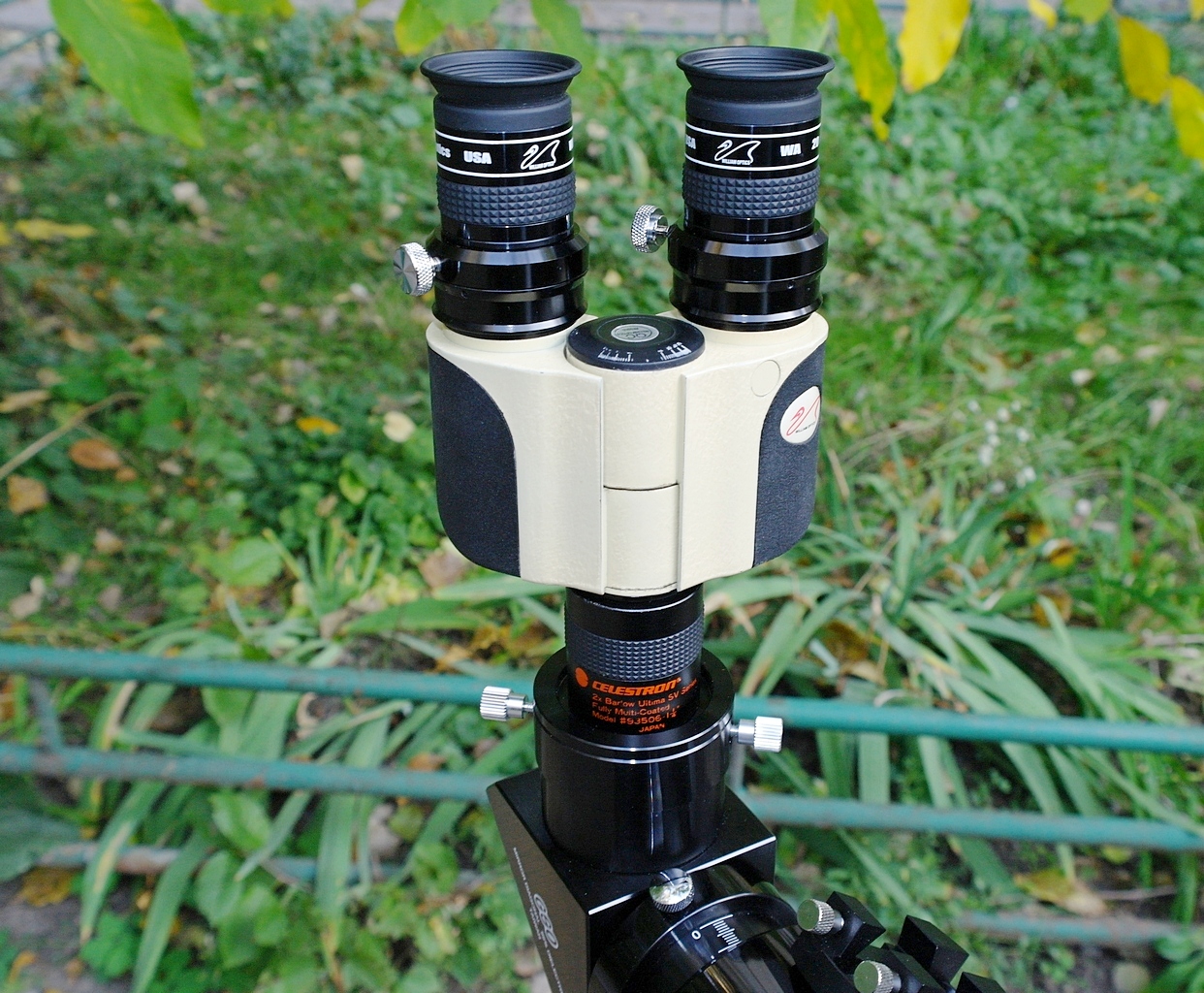 Было отмечено, что комплектные окуляры и бюджетные окуляры SW 15 мм, 66º при работе с линзой Барлоу Celestron Ultima 2x в биноприставке показывают очень хорошее качество изображения. Линза Барлоу Celestron Ultima 2x почти также хорошо компенсирует собственные аберрации биноприставки, как и комплектный Барлоу /корректор.