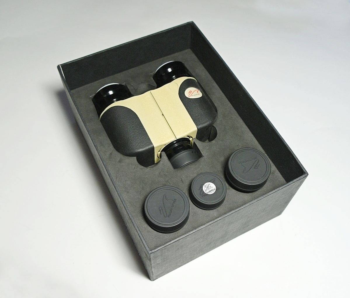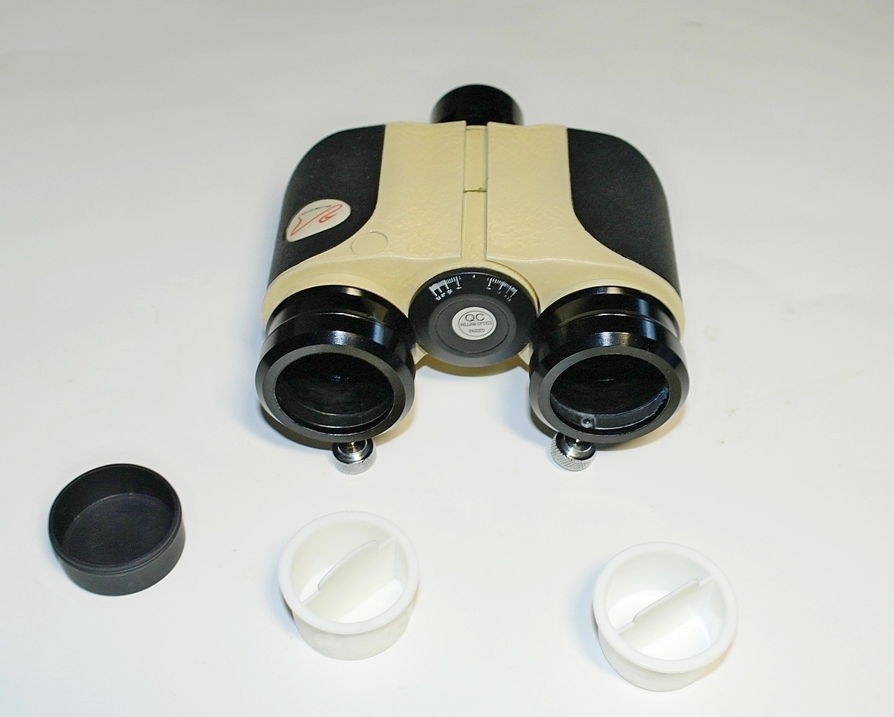 Корпус биноприставки окрашен светло бежевой порошковой краской с легкой шагренью, что тоже придает стильности внешнему виду. В левом канале в черную пластиковую крышку призменного блока вклеен круглый белый шильдик с логотипом фирмы William Optics.