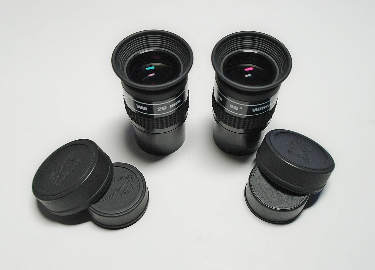 двух окуляров с фокусом 20 мм и полем зрения 66º. Окуляры имеют резиновые защитные крышки на оба торца с логотипом фирмы William Optics. На корпусе окуляров белой краской нанесены надписи “WA/ 20 mm/ 66°/ William Optics USA” и логотип фирмы William Optics. Корпуса окуляров окрашены блестящим черным лаком и выглядят весьма презентабельно;