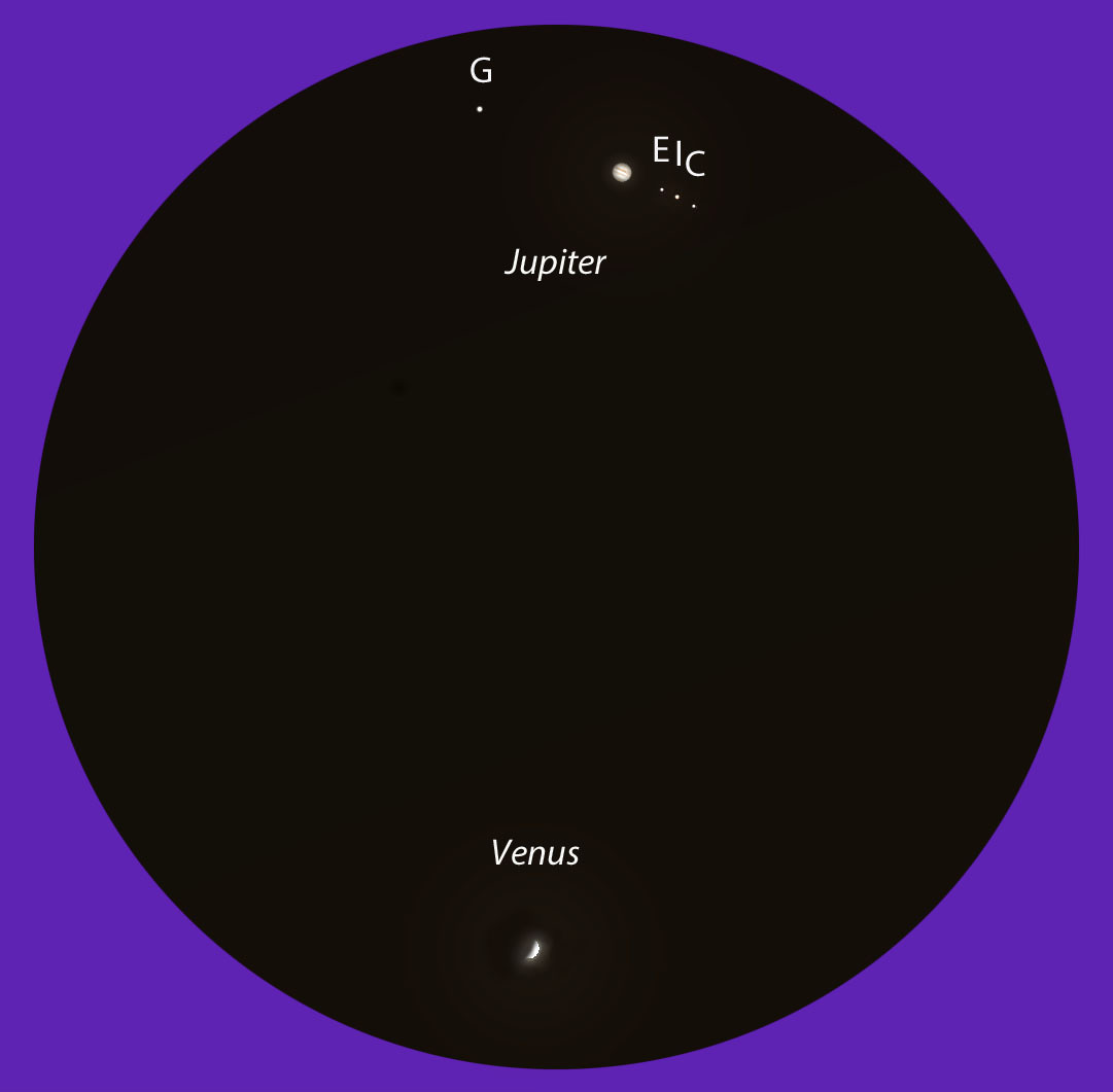 Такое тесное сближение позволяет увидеть в окуляре одновременно две планеты с достаточно большим увеличением, для того чтобы можно было увидеть диски планет. Для сегодняшнего события подойдут увеличения вплоть до 150х с обычным окуляром системы Плёссл. Хотя лично я бы, для полноты осознания окружающего планеты космического пространства, ставил бы 80-100х.