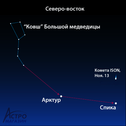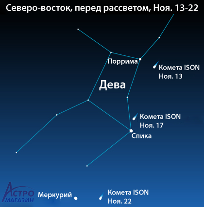 Утром 13-го ноября, незадолго до рассвета, найдите созвездие Девы на северо-востоке, а в нём двойную звезду Поррима которая на грани, но видна невооружённым глазом, в искатель 6х30 это сделать намного прощё, отталкиваясь от значительно более яркой Спики. Комета будет видна в нескольких градусах южнее, как небольшое шаровое скопление, которое не разрешается на звёзды, в телескоп можно будет различить хвост кометы ISON.