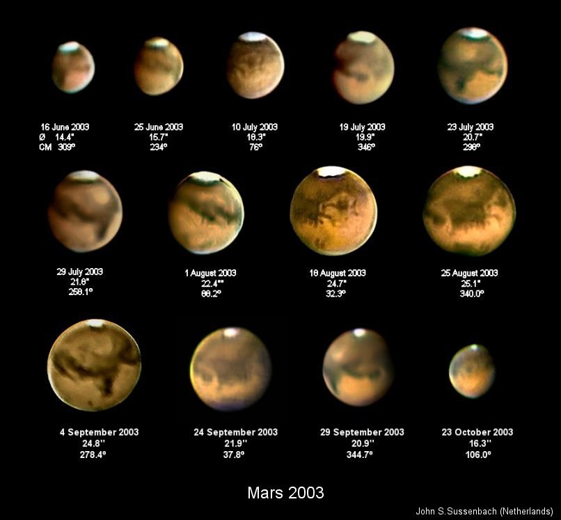 Почему в празных противостоянияниях Марс имеет различный размер? Орбита Марса довольно сильно вытянута, поэтому расстояние от него до Земли от противостояния к противостоянию заметно меняется. Если Марс попадает в противостояние с Землей в афелии, расстояние между ними превышает 100 млн км. Если же противостояние происходит при наиболее благоприятных условиях, в перигелии марсианской орбиты, это расстояние уменьшается до 56 млн километров. Такие "близкие" противостояния называются великими и повторяются через 15-17 лет. Последнее великое противостояние произошло в августе 2003 года (величайшее противостояние, размер Марса был 25,1" дуги или около 1\70 диаметра Луны).