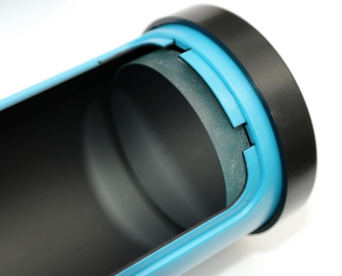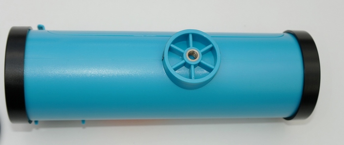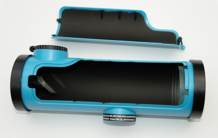 Труба телескопа выполнена из прочного поликарбоната голубого цвета. Длина трубы с фланцами 210 мм, диаметр по фланцам 70 мм, диаметр самой трубы 63,5 мм.