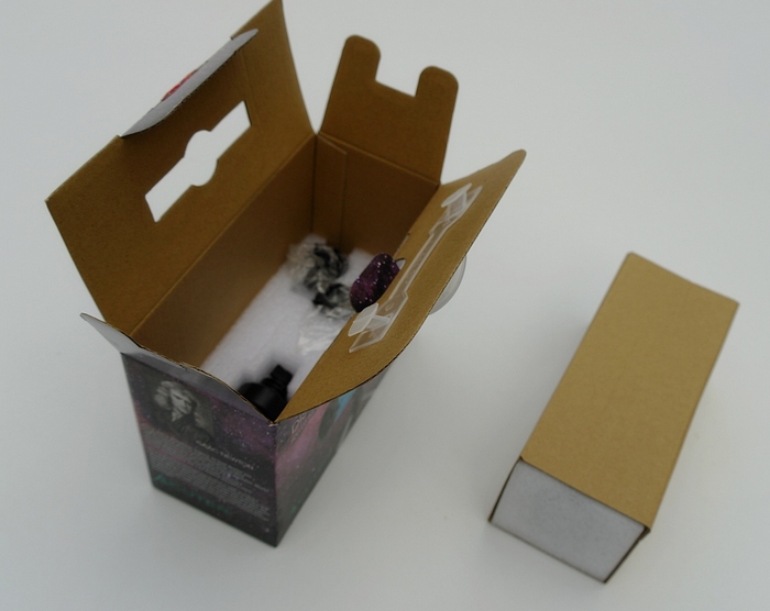 Внутри коробки находится коробка поменьше - размером 225х95х95 мм из тонкого светло-коричневого гофрокартона. В ней находится труба, зафиксированная с торцов двумя ложементами из пенополистирола.