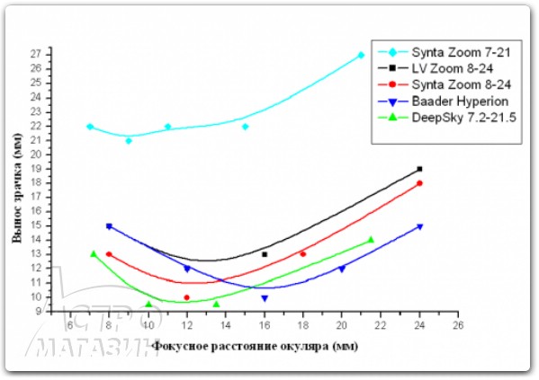 Из графика видно, что наибольший вынос зрачка имеет окуляр Synta Zoom 7-21 мм, однако глазная линза окуляра утоплена в корпус и торец наглазника оказывается на уровне 20мм от глазной линзы.