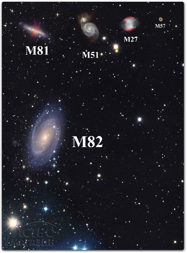 Наверно, каждый любитель астрономии с особым трепетом вспоминает свои первые наблюдения в телескоп, когда удается увидеть Луну, усеянную кратерами, Сатурн с его кольцами, яркое шаровое скопление, которое нашлось почему-то далеко не сразу. Понимание, что каждый астрономический объект требует своего, наиболее подходящего увеличения, приходит далеко не сразу. Постепенно усваиваются некоторые общие правила. Например, принято считать, что обширные туманности лучше всего наблюдать при так называемом равнозрачковом увеличении, численно равным одной шестой диаметра объектива телескопа в миллиметрах. Галактики требуют увеличений в 2-3 раза больших. Шаровые скопления и яркие планетарные туманности лучше всего смотрятся при еще больших увеличениях. Да и для наблюдения планет также одного увеличения недостаточно. Яркий Марс или Венеру лучше наблюдать при больших увеличениях (порядка двух диаметров объектива телескопа в миллиметрах), а Юпитер – при более умеренных. На следующем коллаже собраны самые популярные объекты ночного неба в реальном масштабе.