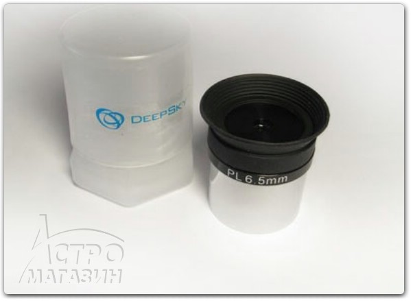 Окуляр поставляется в пластиковом контейнере и имеет самый классический дизайн и внешний вид Плёссла, крышки отсутствуют. В дюралевом анодированном корпусе установлен оптический блок, к которому через резьбу М28 крепится стальная хромированная юбка для посадки 1,25”, на обратном конце юбки резьба М28 подходит для установки стандартных светофильтров. Окуляр неплохо зачернён изнутри и оборудован мягким резиновым наглазником, который делает наблюдения комфортней и всё-таки защищает глаз от паразитных лучей света. Вынос зрачка у этой модели достаточно комфортный, чтобы увидеть полевую диафрагму, необходимо лишь слегка прижаться к наглазнику. На корпусе окуляра синей краской нанесен логотип DeepSky, а белой надпись: «PL 6.5».