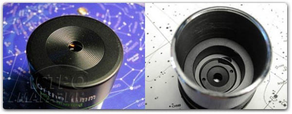 Оптика имеет многослойное просветление зеленого оттенка и черненые торцы линз. При более детальном рассмотрении конструкции настораживает отсутствие полевой диафрагмы как таковой. Разумеется, это приводит к довольно заметным бликам от паразитных лучей света, которые полевая диафрагма и обрезает. Причём такие явления, получается, часто наблюдать на практике. Хорошее просветление и чернение окуляра создают отличный контраст и чёткую, сочную картинку, но в некоторых положениях, например, диска Юпитера, через поле зрения проходит несколько бликов – маленьких «зайчиков», которые возникают в результате светорассеивания на каждой из поверхностей линз. К тому же, из-за отсутствия диафрагмы, становится невозможным небольшой ряд интересных наблюдений, таких например, как наблюдение компонентов двойных звёзд или спутников планет, когда главный источник света, центральную звезду или диск планеты, необходимо просто вывести из поля зрения за диафрагму, чтобы повысить контраст картинки.