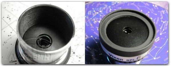 Этот окуляр имеет металлический корпус оптического блока, который снаружи обрезинен и имеет серое пластиковое колечко с надписью: «Vixen NPL 6mm 50° Fully Multi-Coated». На первый взгляд исполнение окуляра может показаться дешёвым из-за пластикового покрытия корпуса, но на практике это очень выгодно, т.к. такое покрытие обеспечивает более удобные условия наблюдения и не обжигает холодом в морозную погоду, а оптический блок всё равно установлен в металлической оправе и точно совместим с посадочной юбкой. Окуляр поставляется в картонной коробке и снабжён двумя резиновыми крышками. На резьбе М28 к корпусу крепится хромированная металлическая юбка с проточкой под зажимные винты или компрессионное кольцо. Модель совместима со стандартными 1,25” фильтрами. Окуляр имеет небольшой наглазник, который, увы, со своей задачей справляется, не очень хорошо, допуская попадание постороннего света. Линзы имеют многослойное просветление зеленоватого оттенка на всех поверхностях. Внутренние поверхности зачернены, и окуляр не имеет сильных бликов. Но расстраивает очень небольшой вынос зрачка у этой модели, который несколько меньше чем у аналогичных Плёсслов. Заявленное поле 50° соответствует действительности, и окуляр вплоть до 80% поля зрения строит резкое и качественное изображение, что является вполне удовлетворительным результатом для симметричного дизайна.