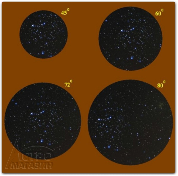 На первый взгляд кажется, что достаточно купить телескоп и Вселенная стразу же откроет нам свои тайны. Как бы ни так! Первые попытки найти слабую туманность, а иногда и яркую планету заканчиваются неудачей. И основной причиной этого является маленькое поле зрения. Даже у сравнительно небольших телескопов с простыми окулярами при тех увеличениях, при которых наблюдают планеты, поле зрения составляет лишь четверть градуса. Под таким углом мы видим спичечную головку на расстоянии вытянутой руки. Что бы объект отыскать было легче, поле зрения должно быть как можно больше. Большое поле зрения важно и при наблюдении обширных туманностей и при наблюдении крупных рассеянных скоплений. Последнее утверждение легко продемонстрировать на примере вида рассеянного скопления М35. Если в окуляр с полем зрения 45 градусов будет видно только большая часть скопления, то в окуляр с полем зрения 60 градусов мы сможем рассмотреть скопление целиком, окуляр с полем зрения 72 градуса позволяет любоваться скоплением на фоне окрестностей, а в окуляр с полем зрения 80 градусов мы можем рассмотреть помимо М35 соседнее скопление NGC2158.
