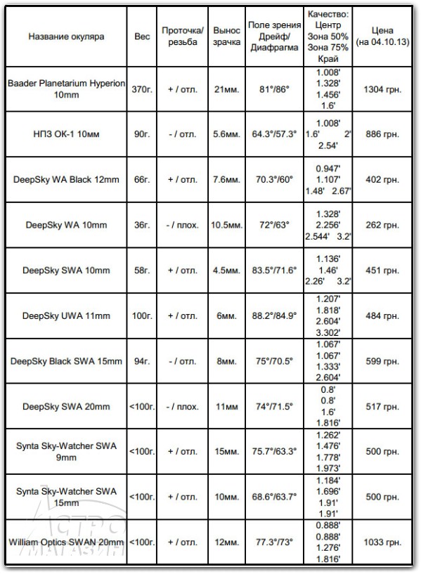 Напоследок, приведу наиболее важные характеристики окуляров в табличном виде: