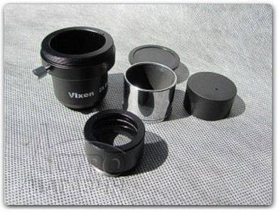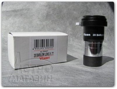 Это типичная 2х Барлоу с наличием Т-резьбы под установку фотоаппарата через Т-кольцо. Идентичные линзы Барлоу имеются также у Synta Sky-Wastcher и Celestron, отличаясь от Vixen, обычно только наклейками и логотипами. Данная модель поставляется в симпатичной коробочке, завернутая в пакет и закрыта двумя крышками для оптического блока и окулярной посадки. Особенность данной модели именно в Т-резьбе, мелочь конечно, но наличие такой функциональности привлекает. Ведь без проблем, снимая зеркальной камерой в прямом фокусе телескопа, можно перейти в эквивалентный, установив Барлоу и на неё фотоаппарат. В конце концов, открутив оптический блок, корпус можно использовать как переходник на 1,25”, или держатель светофильтров, а сам оптический блок можно присоединить к любому окуляру, на резьбу светофильтра. Корпус представляет собой стандартную трехкомпонентную конструкцию – оптический блок, юбка с внутренней резьбой М28 (подойдёт для установки светофильтров) и корпус для крепления окуляра и Т-резьбой. На корпусе присутствует лого фирмы и надпись «Vixen 2x Barlow». Юбка имеет неглубокую проточку, для предотвращения выпадения с фокусёра в случае неплотной затяжки винта.