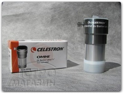 Данная модель имеет совершенно классический дизайн ахроматической линзы Барлоу с двухкомпонентной склейкой, имеющей отличное просветление и превосходное чернение. Корпус делится на три блока: оптический блок в оправе, юбка, корпус для установки окуляра с зажимным винтом. Оптика защищена от пыли парой плотных крышек. Корпус имеет симпатичное и износостойкое покрытие снаружи, но также и плотное чернение внутри. На внешней стороне присутствует логотип фирмы производителя и надпись «Celestron OMNI 2x Barlow Lens Fully Multi-Coated Taiwan».