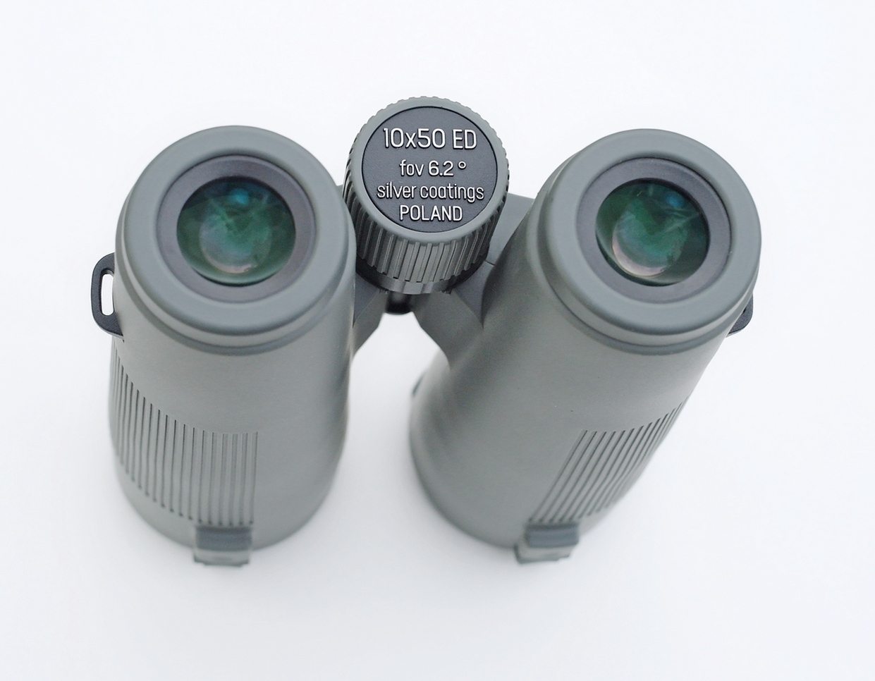 У Delta Optical Chase 10x50 ED соответственно надпись "10x50 ED// FOV 6.2º// silver coatings //POLAND//". С внешней стороны труб биноклей, ближе к окулярам, расположены скобы для нашейного ремешка.