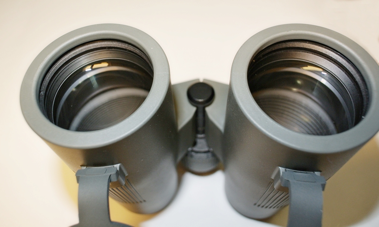 Призмы также бликуют покрытием голубовато-зеленоватого отлива. За блоками объективов внутри труб выполнена развитая система защиты от скользящих боковых бликов (кольцевое рифление и невысокие ребра светозащитных диафрагм). Лизы объективов бинокля утоплены на 8 мм относительно переднего среза.