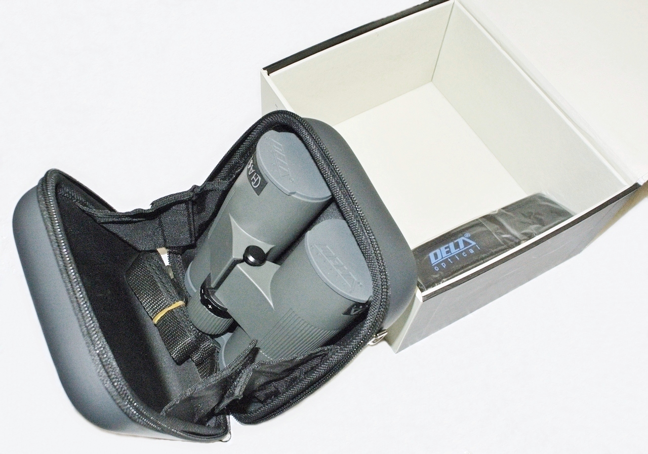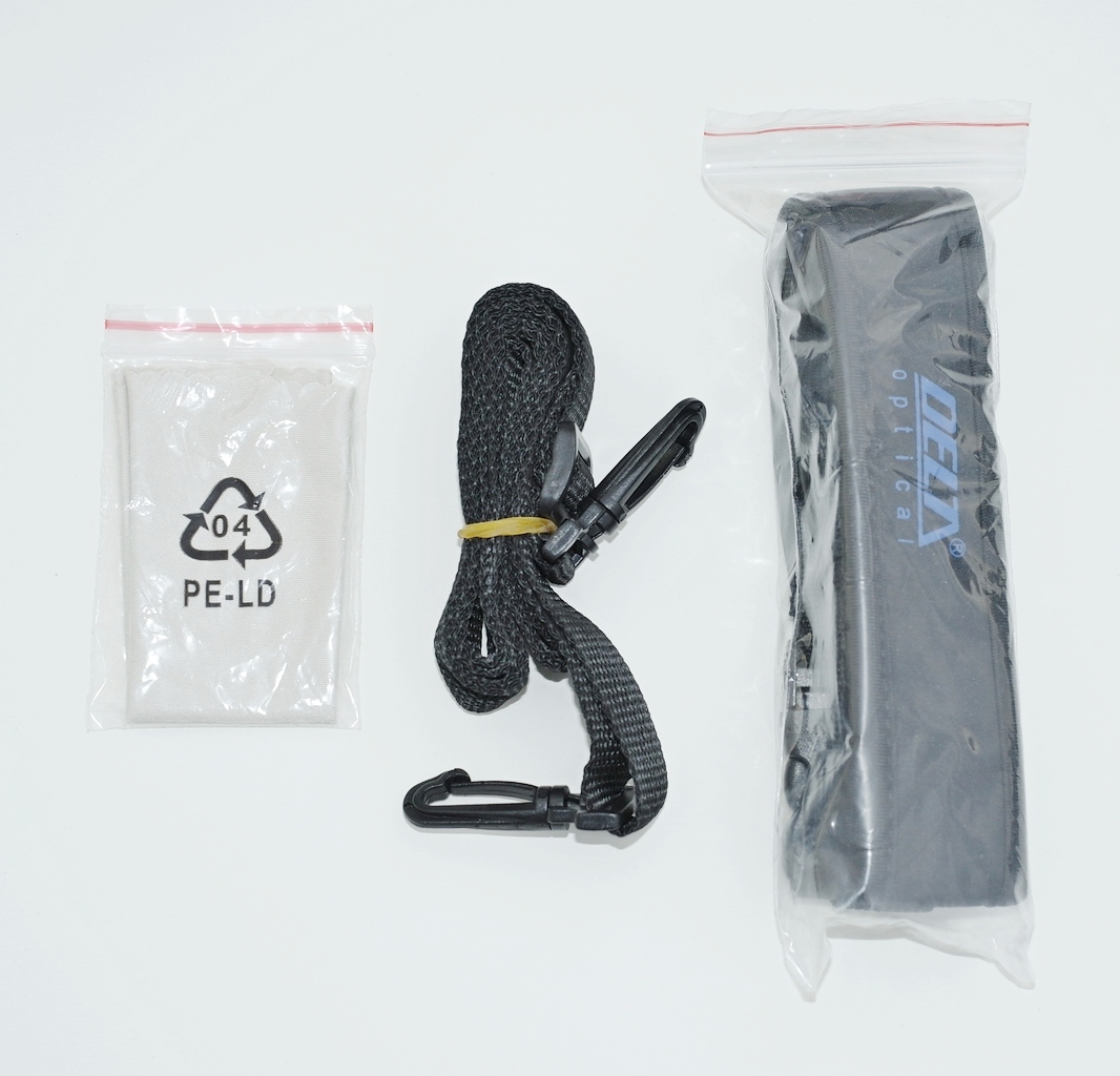 Внутри упаковочной коробки находится бинокль в аккуратном прорезиненном полужестком кейсе-футляре и красивый фирменный нейлоновый ремень с логотипом Delta Optical для ношения бинокля. Футляр небольшой, сделан под размер бинокля. Посередине футляра вшита застежка типа "молния". Внутри футляра кроме самого бинокля еще находится ремешок поуже для ношения кейса-футляра и салфетка из микрофибры для протирки оптики.