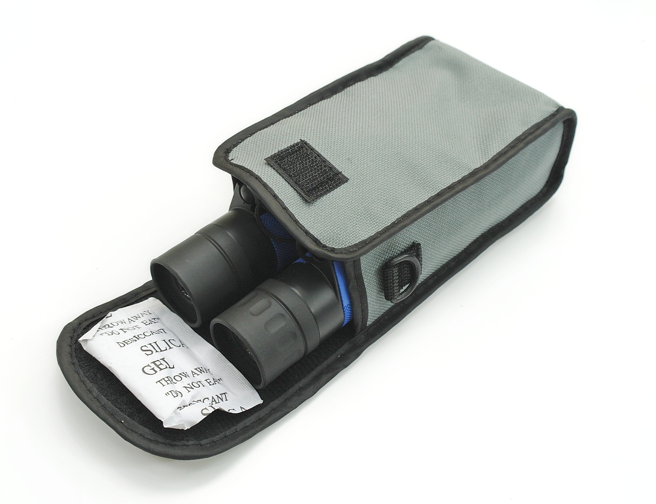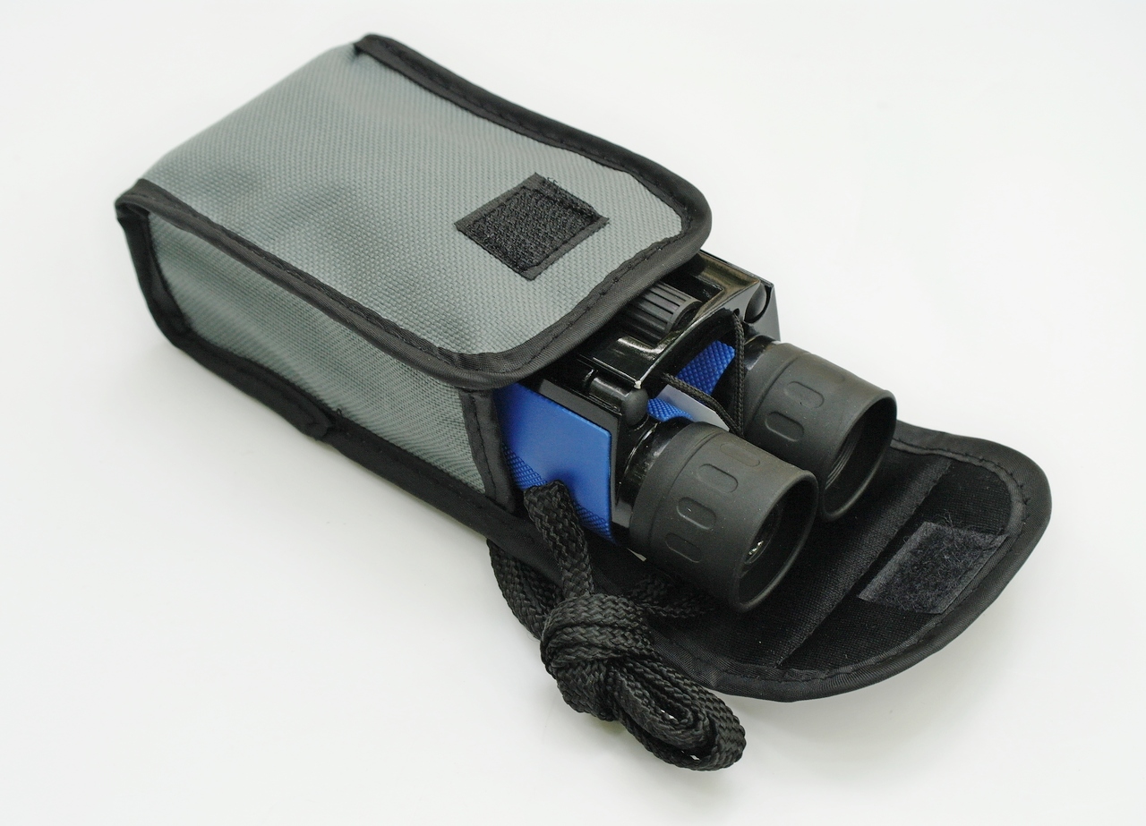 Внутри футляра находится бинокль в сложенном состоянии, салфетка для протирки оптики и пакетик с силикагелем.