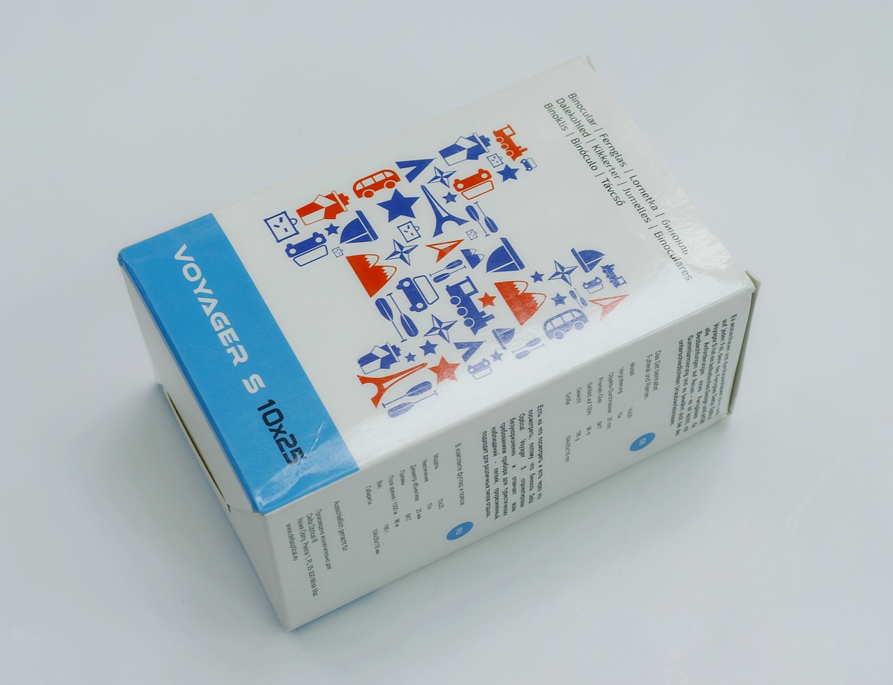 Бинокль поставляется в коробке размером 143х95х67 мм из тонкого лощеного картона с типографской полноцветной печатью. На передней и задней стороне коробке нанесено название модели Delta Optical Voyager S 10х25 и выше изображена картинка с символикой, соответствующей различным видам путешествий, намекающая, что содержимое коробки имеет к путешествиям самое прямое отношение.