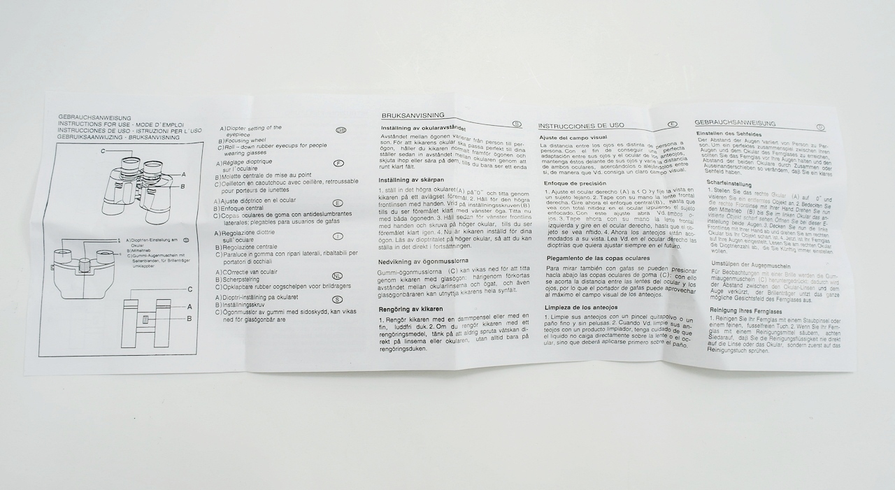 С торцов коробки на четырех языках (английском, немецком, польском и русском) выполнены надписи кратких технических характеристик бинокля и информация о его назначении, а также сведения о производителе.
