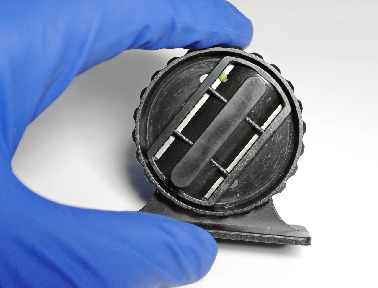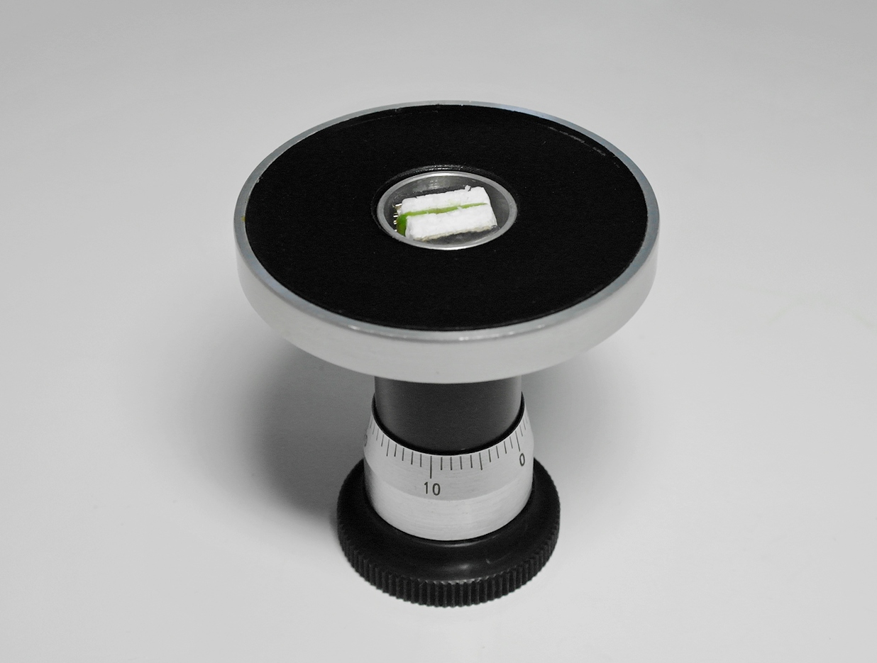 Верхняя часть корпуса изготовлена из черного полированного анодированного металла и имеет внутренний диаметр 21 мм. Внутри нее находится фиксатор, состоящий из двух плоских металлических пластин из нержавейки, имеющих на рабочей стороне накатку с шипами для удержания при изготовлении срезов биологического материала. Одна пластина фиксатора прикреплена к стенке фиксатора. Вторая пластина подвижная, подпружиненная ленточной пружиной. Биологический материл фиксируется блестящим винтом М4 с большой круглой головкой с накаткой. При вкручивании винта пластины сдвигаются и фиксируют образец, при выкручивании винта пластины раздвигает возвратная пружина. Максимальное расстояние, на которое могут быть раздвинуты пластины - 13 мм.