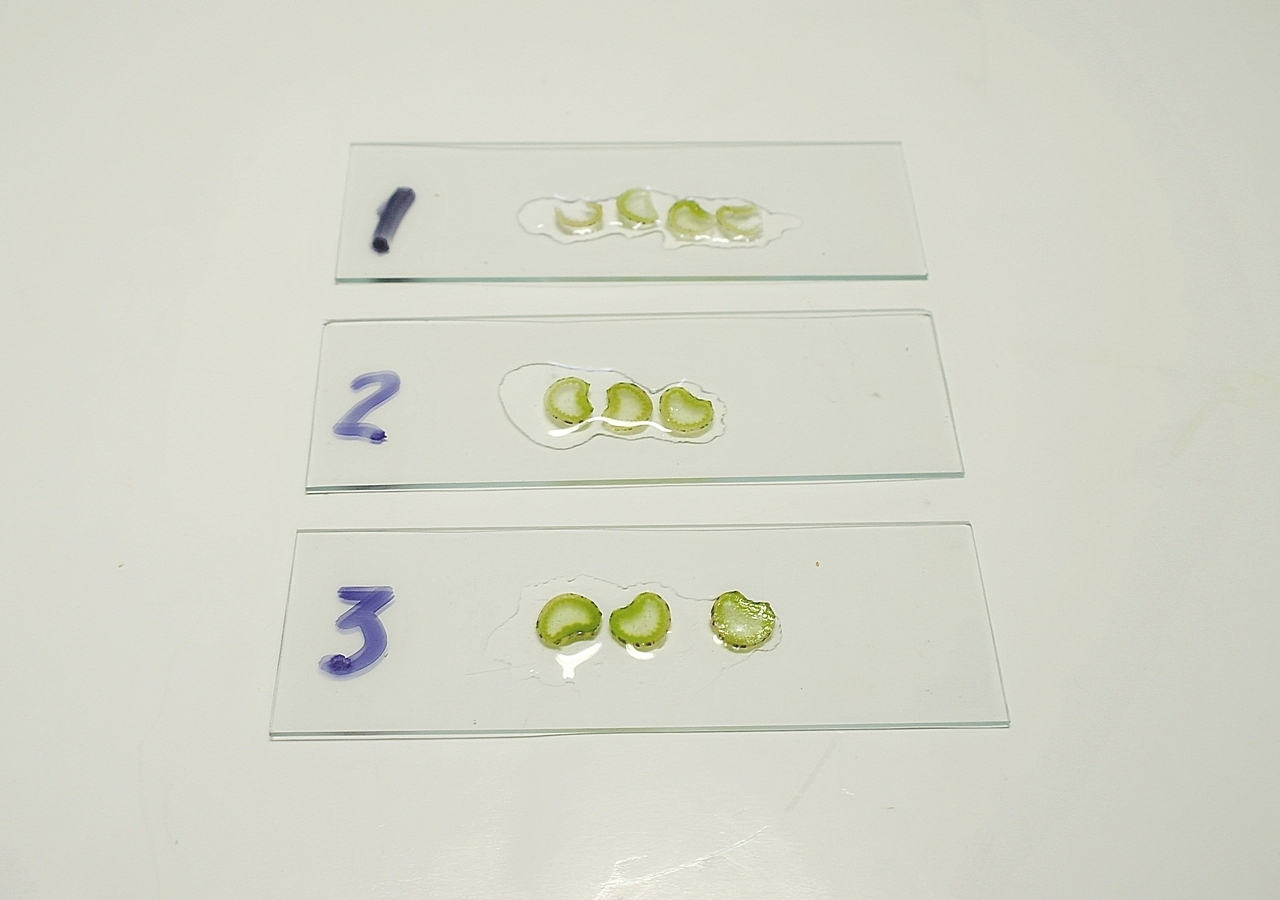 В процессе работы с микротом Delta Optical школьный и микротом Delta Optical ручной с лезвием были изготовлены срезы: стебля конского щавеля, молодого побега дикого винограда, стебель цветка лилии и пиона. Дополнительно были сделаны срезы указанного биоматериала обычным лезвием для безопасной бритвы.