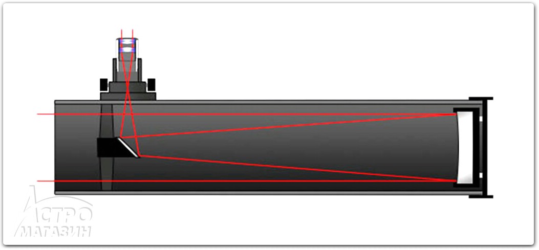 В телескопах Ньютона объективом выступает высокоточное вогнутое сферическое или параболическое зеркало, которое находится в нижнем конце трубы. Свет, собранный главным зеркалом, отражается на плоское вторичное зеркало, установленное в переднем конце трубы под углом 45°, которое в свою очередь и отражает конус света в сторону стенки трубы в окулярный узел. Ньютоны, как правило, имеют светосилу от 1/8-1/10 до максимально форсированных модификаций с 1/4-1/5.