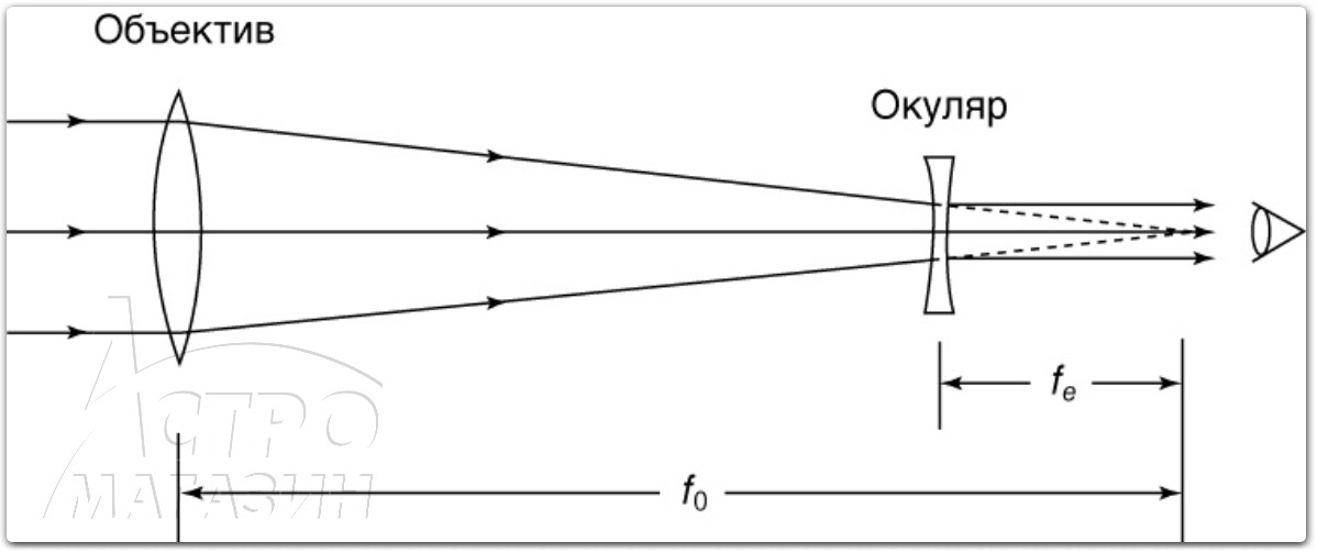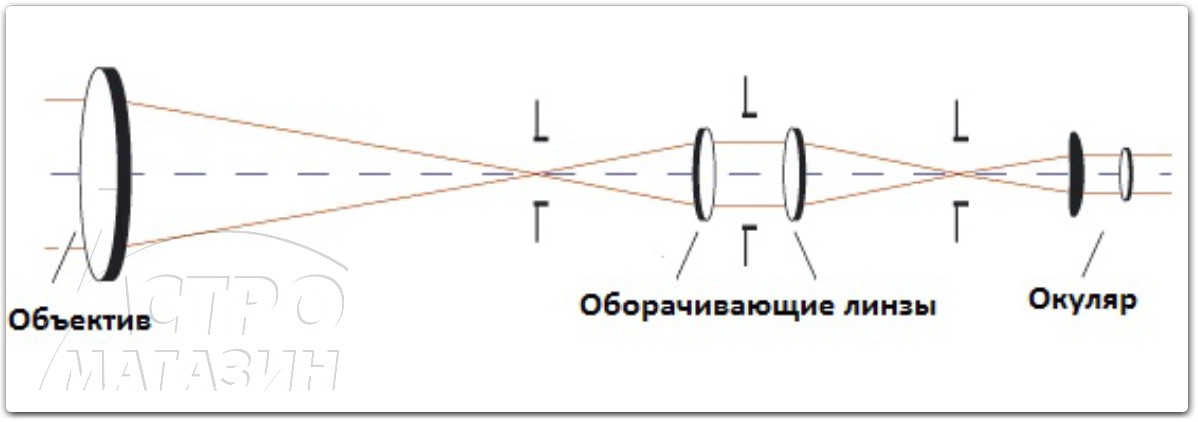 В системе Галилея, технически, оборачивающие элементы отсутствуют вовсе. Дело в том, что конический пучок света, собранный объективом, рассеивается отрицательной линзой до параллельных лучей. Эта линза устанавливается непосредственно перед фокусом объектива и выполняет, собственно, роль окуляра. Выходит, что лучи просто не успевают пересечься в фокусе и картинка остаётся неперевёрнутой.