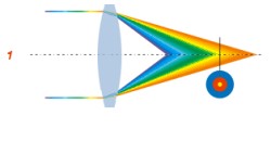 Это значит, что вместо точки, где лучи света сходятся, у нас получается линия с распределением по цветам: коротковолновые - фиолетовые, синие, точки схождения расположены на этой линии ближе к линзе, красные (длинноволновые) находятся дальше от линзы. Если мы расположим окуляр на этой лини и будем двигать его от линзы назад, мы увидим как сначала в фокусе будут синяя составляющая изображения, с зелёной и красной окантовкой, постепенно синий начнёт расфокусироваться, в фокусе окажется зелёный, а красный ореол станет значительно меньше. Ближе к "красному" концу линии мы увидим что сфокусирован желтый, красный постепенно приближается к фокусу, а синий значительно расфокусирован.