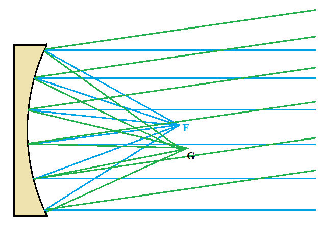 Голубым цветом показаны лучи, идущие от звезды, на которую направлен телескоп. Из-за огромной удаленности звезд эти лучи будут распространяться практически параллельно. Если у главного зеркала поверхность имеет правильную параболическую форму, то все голубые лучи соберутся в одной точке F, называемой фокусом. Если мы будем рассматривать изображение звезды при помощи окуляра или разместим в фокальной плоскости ПЗС матрицу, то мы увидим звезду в виде точки (справедливости ради нужно заметить, что при большом увеличении и идеальной атмосфере эта точка превратится в круглый крошечный диск, окруженный кольцами и такая структура связана с волновой природой света). Теперь посмотрим, что при этом произойдет с лучами зеленого цвета, идущими от другой звезды, находящейся на некотором угловом удалении от той, на которую наведен телескоп. Оказывается, что в этом случае они уже в одной точке не соберутся. Вместо точки мы увидим размазанное пятно. Размеры этого пятна будут тем больше, чем дальше от центра поля зрения расположена звезда и чем большую светосилу имеет зеркало. Глядя на изображение такого пятна оптик скажет, что изображение звезды искажено внеосевыми аберрациями.