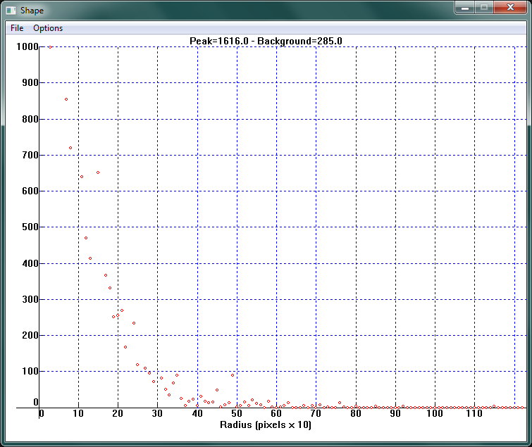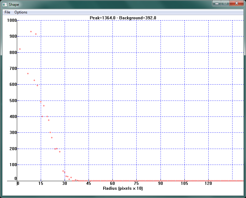 Полуширина пиков звезд составила примерно три пикселя, причем распределение яркости пикселей при удалении от центра звезды имеет хорошую колоколообразную форму.