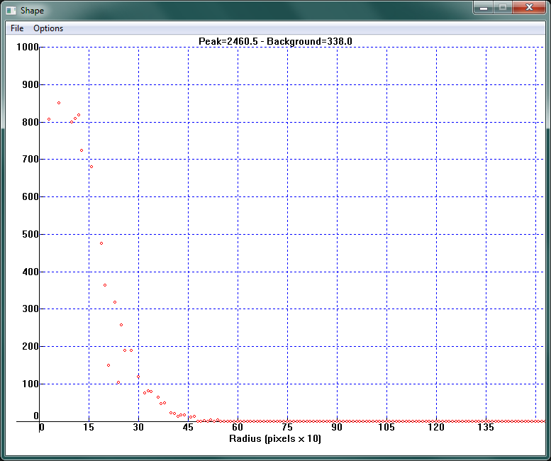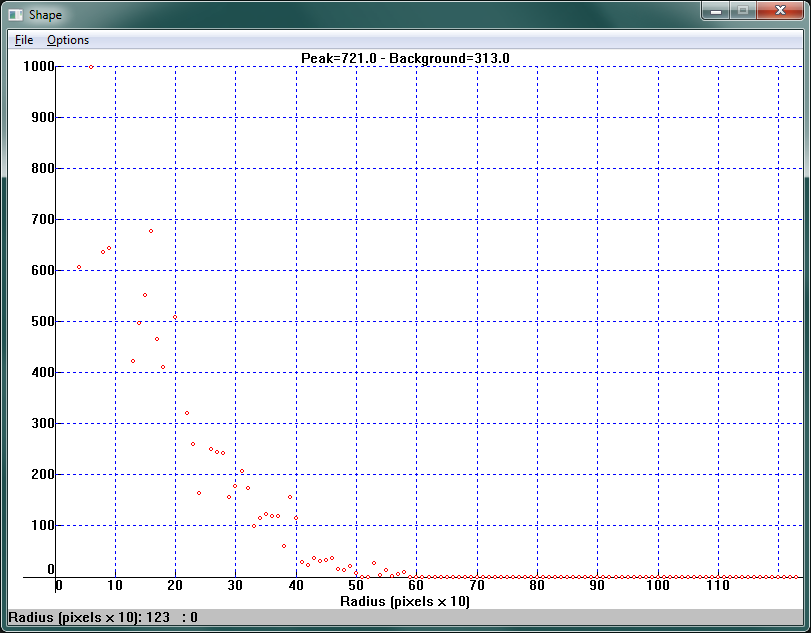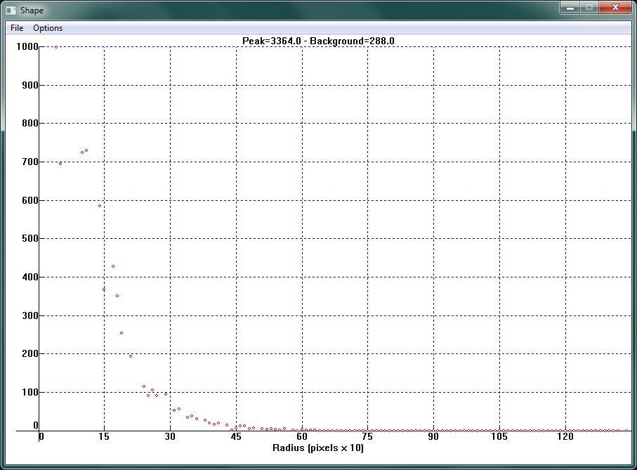 Изучение формы пика ярких звезд показало, что звезды в центре поля зрения при такой ошибке имеют концентрическую форму, а полуширина пика (область, где яркость превышает половину от максимального значения) составляет около трех пикселей. (Все измерения во время тестирования проводились на телескопе системы Ньютона GSO c диаметром зеркала 150мм и относительным отверстием 1:4).