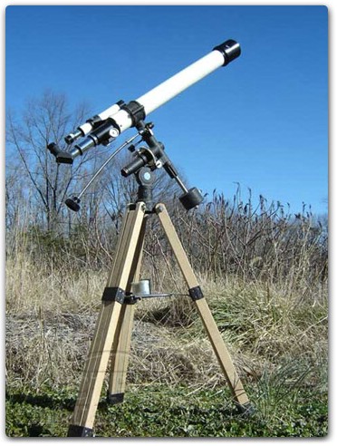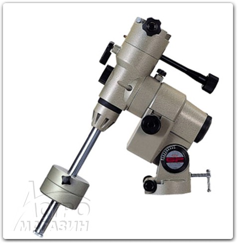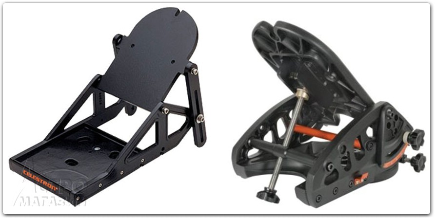 Интересно также и то, что азимутальные монтировки такого класса довольно просто могут быть превращены в экваториальные с применением специального экваториального клина. Это устройство представляет собой две платформы, одна из которых устанавливается на треногу телескопа, а другая жестко закреплена на нижней платформе монтировки. Верхняя платформа на специальных кронштейнах наклонятся, параллельно с небесным экватором, что позволяет направить вертикальную ось монтировки на Полюс Мира.