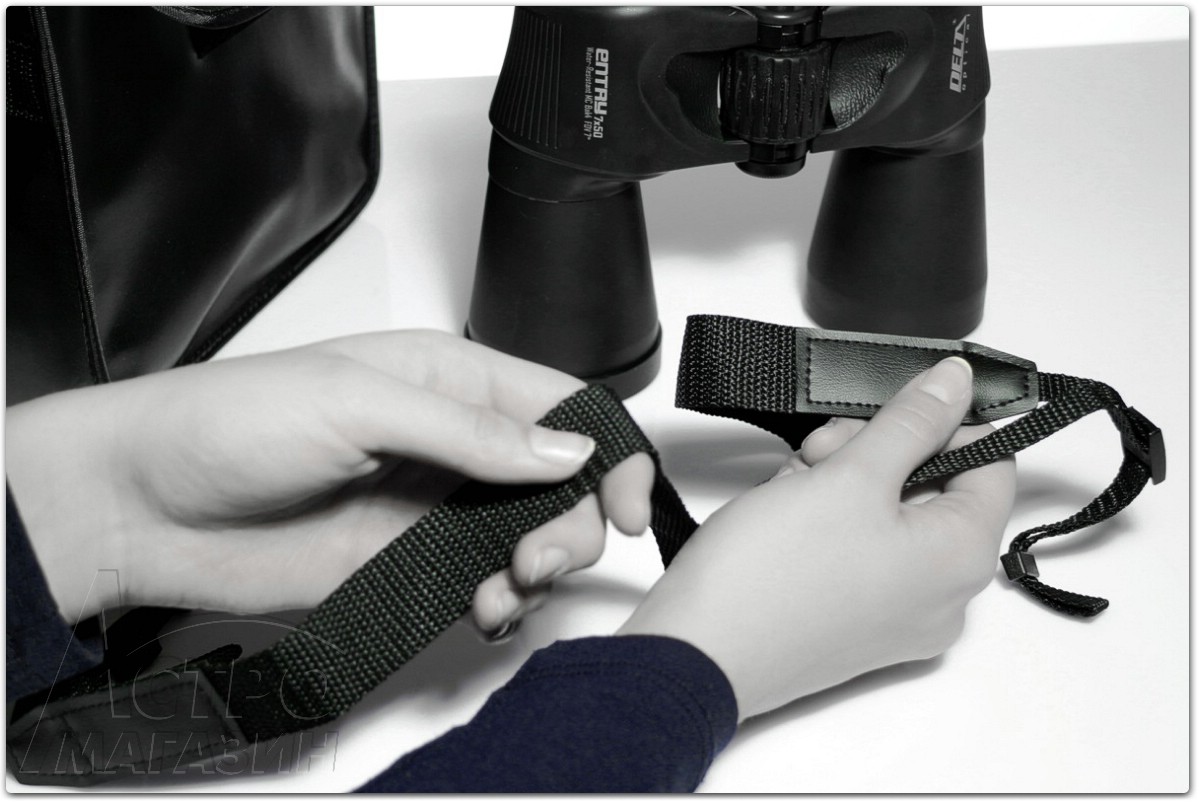 Нашейный ремень бинокля оказался тоже весьмва скромным, он изготовлен из грубой нейлоновой ленты и может натирать шею. Его, всё-таки, лучше одевать поверх одежды.