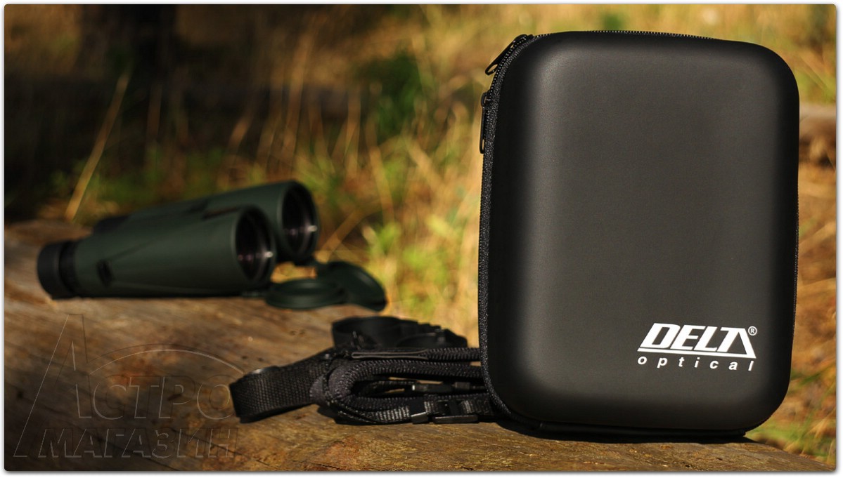 Внутри коробки находим полужёсткий кофр, имеющий приятное покрытие и возможность переноски на ремне. Без сомнений, такой чехол обеспечит защиту бинокля даже от сильных ударов и уж точно не даст повредить оптику в рюкзаке с другим снаряжением. Внутри инструкция, поясок на чехол и мягкий удобный ремень для бинокля. Это пожалуй самый широкий и удобный ремень во всей линейке Delta Optical, даже у серии Extreme был попроще. Бинокль явно рассчитан на постоянное активное использование и переноску на шее.