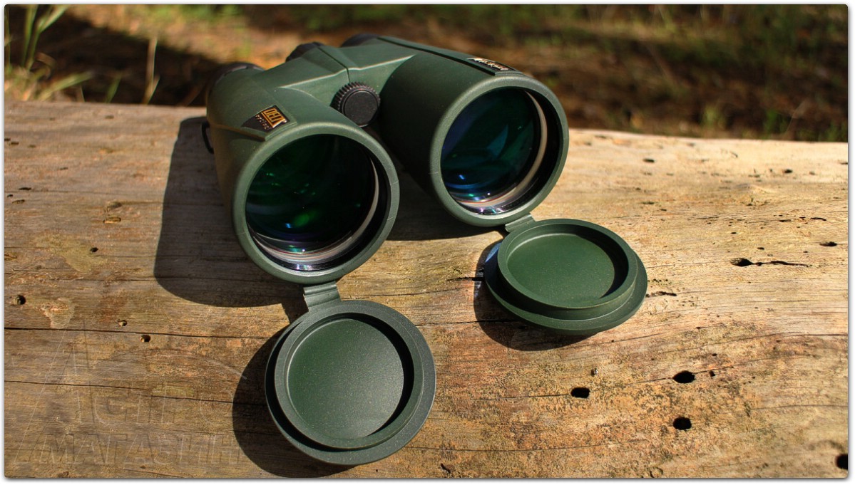 Оптика бинокля защищена удобным комплектом крышек. Крышки на окуляры изготовлены из мягкой резины, сидят очень плотно и фиксируются на ремне. Объективы защищены откидными крышками, которые во время наблюдений остаются висеть на резинках. Решение простое, но очень толковое. Наверное, невозможно сосчитать количество крышек от бинокля, которое растеряно по самым диким местам планеты. Бывалые, во время ношения бинокля на шее, привыкли снимать крышки объективов и носить их в кармане. Здесь в этом нет необходимости, после наблюдений можно закрыть объективы для защиты от грязи - крышки никуда не денутся.