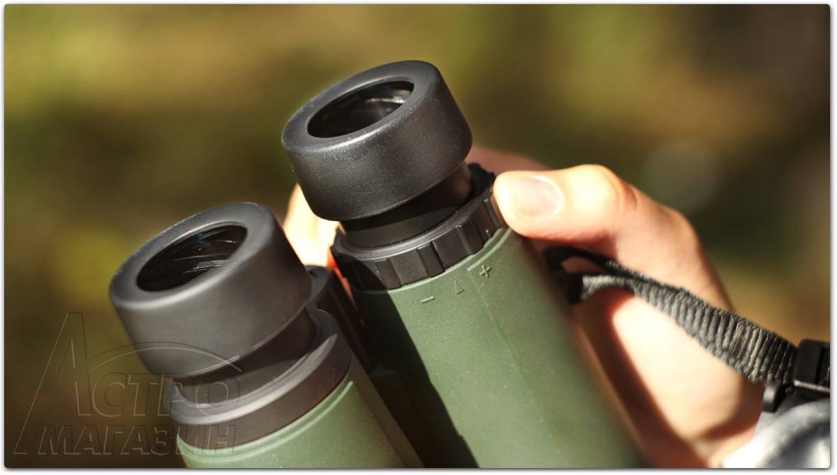 Окуляры бинокля имеют комфортный вынос зрачка и регулируемые наглазники. В крайнем положении наглазник фиксируется щелчком и это наиболее удобно для наблюдений без очков. Чтобы смотреть в очках, достаточно просто убрать наглазники. Под правым окуляром традиционно находится диоптрийная коррекция. Вращается довольно туго, но зато хорошо держит настройку.