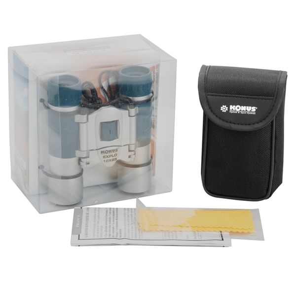 Модель Konus EXPLO 10x25 обладает десятикратной силой приближения: при ее скромном весе (200 г) это весьма внушительный показатель. В центральной части корпус бинокля имеет рифленые прорезиненные вставки для предотвращения проскальзывания тубусов в руках.