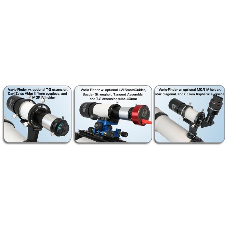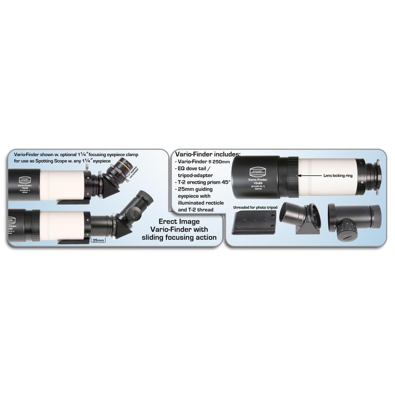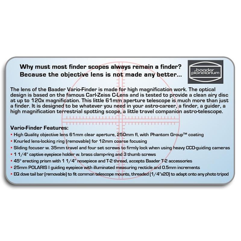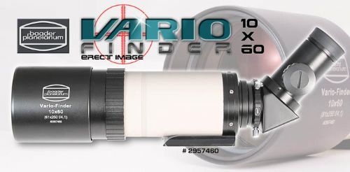 Если вы ищете качественный, универсальный небольшой телескоп-искатель, вам нужен Baader Planetarium Vario 10X60. Этот небольшой ахроматический рефрактор, оптика которого разработана специалистами фирмы Carl Zeiss. Фокусное расстояние двухэлементного 60мм объектива составляет 250мм, он имеет светосилу f4,16. Это позволяет использовать телескоп как гид, и в сравнении со стандартными f5-f6 гидами, вы получите больше звёзд для гидирования с равной выдержкой и усилением камеры.