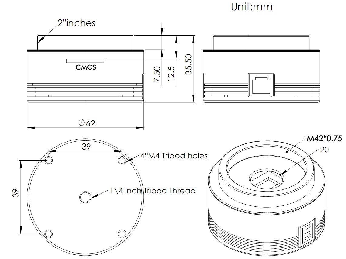 Датчик изображения CMOS с 14-разрядным ADC. ASI178MM имеет диагональ 1/1,8" и 6,4 мега-пиксельный датчик IMX178 от SONY STARVIS и Exmor R Technology. Чрезвычайно низкий уровень шума (2.2e -1.4e), высокая чувствительность и 14-битный ADC делают ее очень подходящей для астрофотографии и микроскопии.