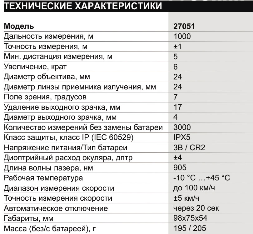Прибор отличается небольшой мощностью передачи сигнала, что исключает отрицательное воздействие на человеческий глаз. Прибор имеет малый вес и габариты, легок и прост в использовании. Питание прибора осуществляется от одной батареи типа CR2/3В. Дальномер может использоваться для различных сфер применения: путешествия, туризм, гольф, охота, отдыха на природе и других.