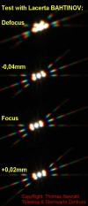 Маска фомирует из каждого точечного источника света (звезды) три луча, котроые смещаются в зависимости от положения фокуса. При этом видна мельчайшая погрешность юстировки.