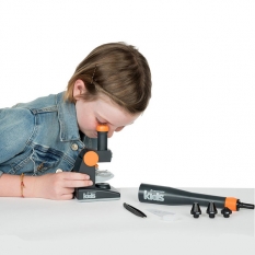 Благодаря объективам 5x, 15x, 25x и окуляру 10x микроскоп из набора работает на увеличениях от 50 до 250 крат. Прибор оборудован двойной подсветкой – сверху и снизу, позволяющей рассматривать как плоские образцы на стекле, так и достаточно объемные непрозрачные предметы – монетки, камни, листья и даже больших насекомых. Подсветка работает от двух обычных АА-батареек, которые нужно приобретать отдельно.