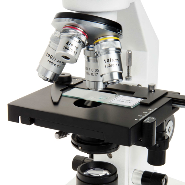 Лабораторный бинокулярный микроскоп имеет 2000 кратное увеличение, два окуляра (10x и 20x), четыре полностью ахроматических объектива (4x, 10x, 40x, 100x). Исследуемые образцы можно изучать при увеличении 40x, 80x, 100x, 200x, 400x, 800x, 1000x и 2000x. Имеется регулируемая бинокулярная насадка (головка), способная к вращению и изменению своего положения. Цельнометаллическая конструкция устройства полностью механически регулируемая. Есть как макровинт, так и микровинт для регулирования четкости изображения. В микроскоп встроена регулируемая галогенная подсветка с нижним конденсором Аббе и ирисовой диафрагмой. Приятным бонусом являются включенные в комплект несколько готовых микропрепаратов. Помимо этого имеется универсальный адаптер переменного тока.